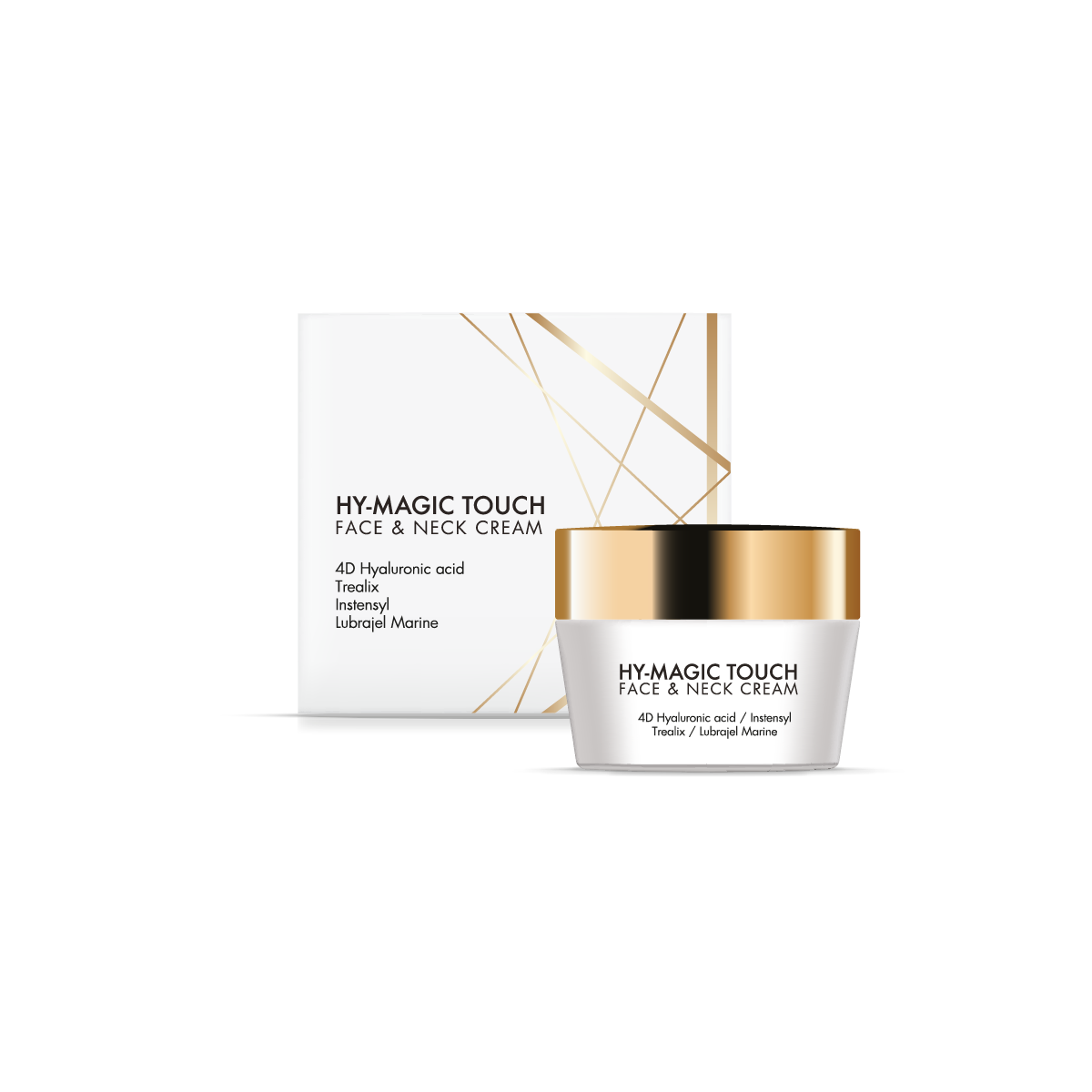Sustiprinta formulė, skirta greitam brandžios ir klimato pažeistos odos stangrinimui bei anti-senėjimo poveikiui. **HY-MAGIC TOUCH** kremas, kuriame derinami 4 skirtingų savybių hialurono rūgščių tipai, užtikrina intensyvų drėkinimą visiems odos sluoksniams – ideali kasdienė priežiūra. Kremas praturtintas novatoriškais ingredientais **Intensyl** ir **Trealix**, kurie sukuria viskoelastinį sluoksnį (antrąją odą).