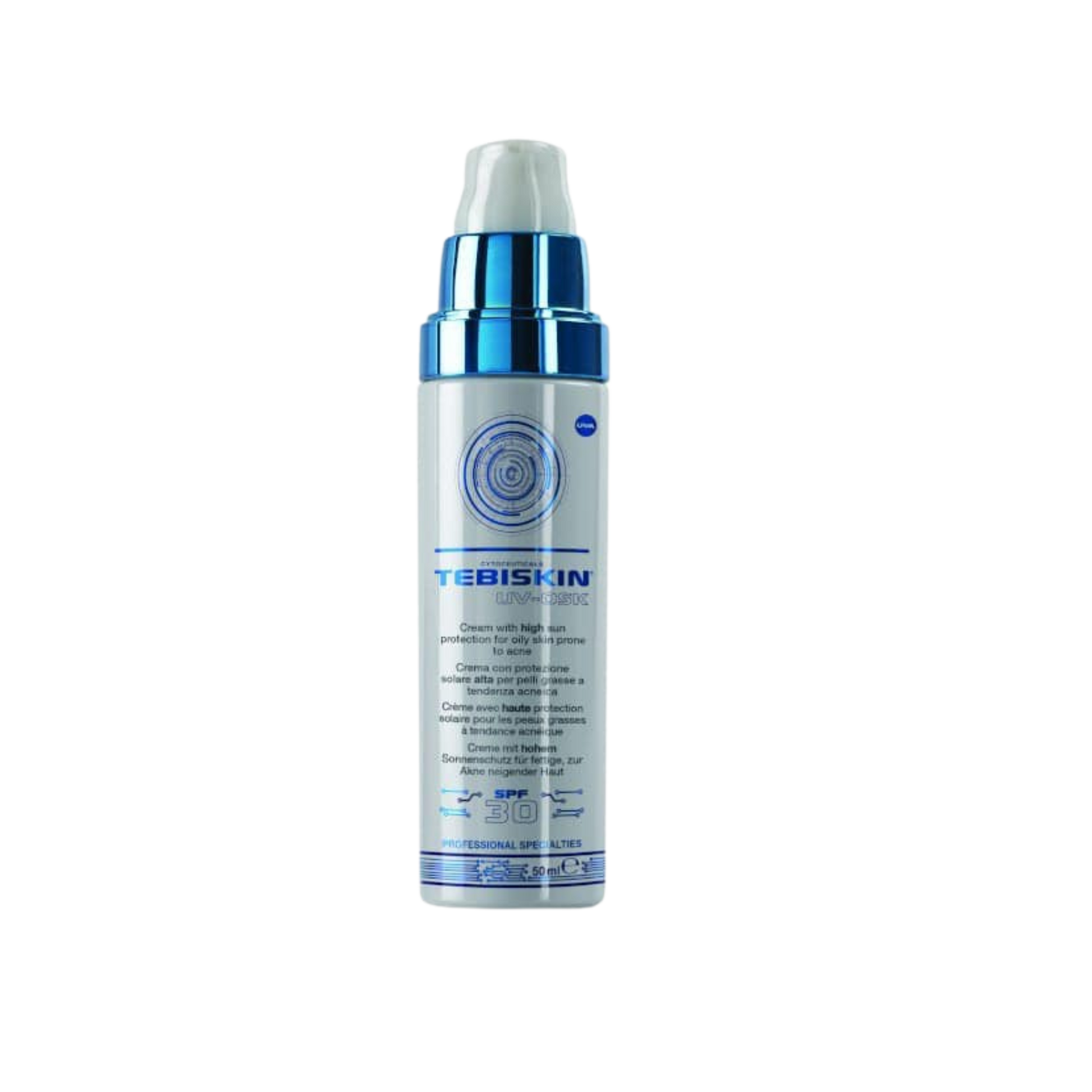 TEBISKIN® UV-OSK SPF 30 apsauginis kremas nuo saulės riebiai odai, linkusiai į aknę apsaugo odą nuo ultravioletinių spinduli ir mažina perteklinę sebumo gamybą.