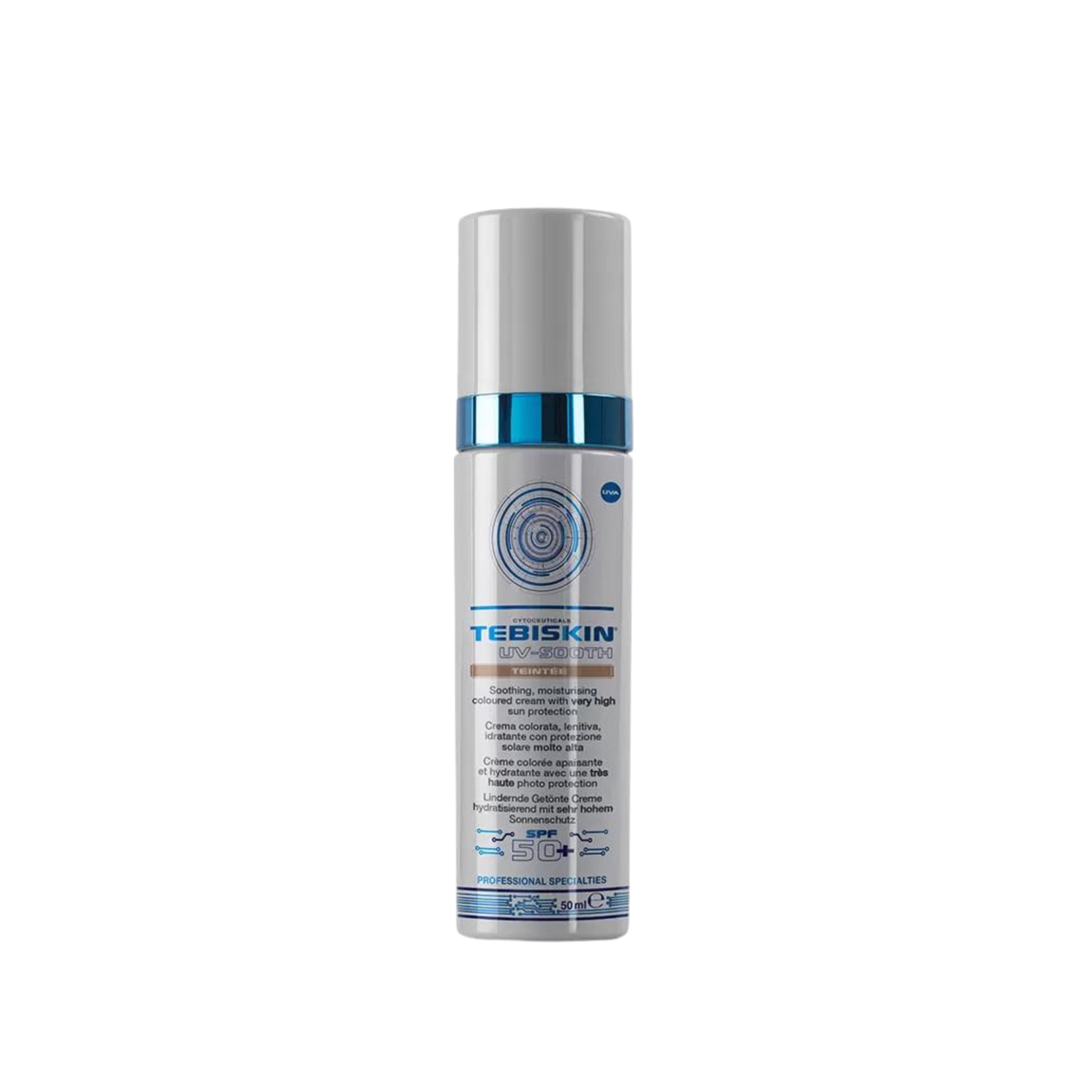 TEBISKIN UV-SOOTH TEINTEE SPF50+ Tonuojantis kremas SPF 50 +, kuris pasižymi maskuojančiu poveikiu ir aukšta apsauga nuo saulės spindulių.